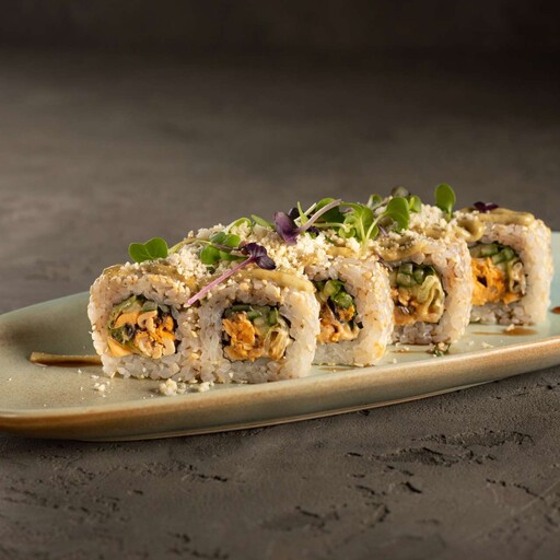 Состав: рис маринованный, лосось, темпура острая, салат айсберг, огурец ким-чи, соус фудзиро, водоросли нори, соус васаби, соус терияки, крошка из пармезана, лук зеленый. Состав соуса Фудзиро: майонез Хелманс, сыр сливочный, соус соевый, укроп, огурцы маринованные, чеснок, масло кунжутное. Состав соуса Васаби: васаби порошок,соевый соус,уксус мицукан,мед,майонез,краситель зеленый пищевой,ксантановая камедь. Состав соуса Терияки: мирин,сахар,соус соевый,вино белое сухое,корень имбиря,чеснок свежий,крахмал кукурузный,вода. Подаются с соевым соусом (соус соевый концентрат,бульон бонито(дрожжи хондаши,соевый соус,стружка тунца) На 100гр продукции: б/ж/у: 10,29/10,71/28,59 ккал/кДж 251,86/1053,78 Выход блюда: 210 гр (порция 10 кусочков)